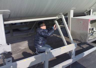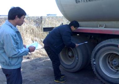 在春节期间我部门组织对高,中压罐车以及牵引车头进行安全设施大检查,检查项目包括灭火器(有效期,缺少)。安全告示,易燃三角牌,圆形爆字(老化,缺少)。静电接地线(断裂,老化,接地是否到位)。刹车以及灯光。在此次的安全大检查当中添加并更换灭火器30余支,安全告示,易燃三角牌,圆形爆字共12张,静电接地线30根。车辆刹车保养5台,在此次大检查后为保证车辆安全运行凡是进站车辆进站检出站查,确保每一辆车没有安全隐患。